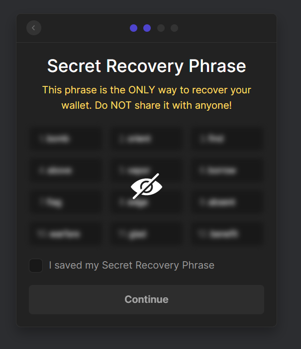For the secret recovery phase, make sure you store it somewhere offline as it is the only way to recover your wallet. Do not share it with anyone. Once done tick the box and click on “Continue”.